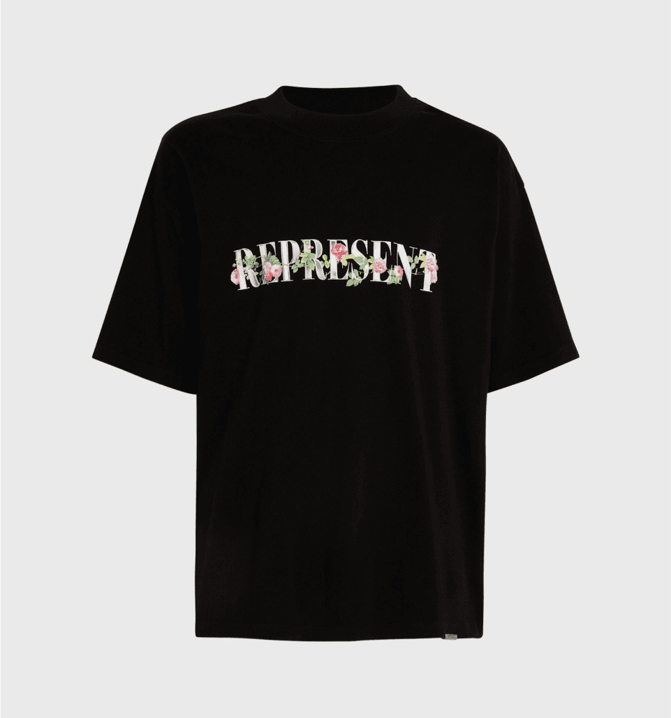Apresentando a camiseta Floral Initial em preto, confeccionada em jersey de algodão de luxo de peso médio em um corte ligeiramente oversized. Esta camiseta apresenta nosso design floral cromado nas costas e estampa floral Represent na frente.